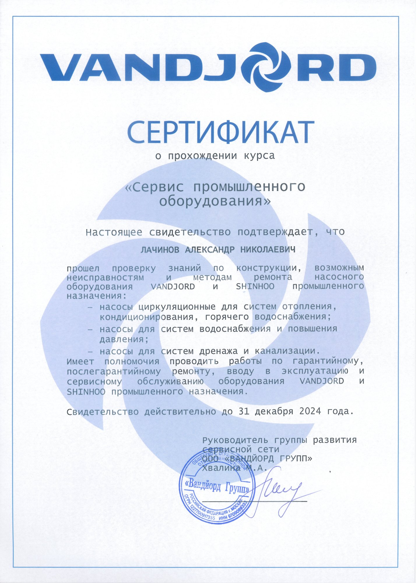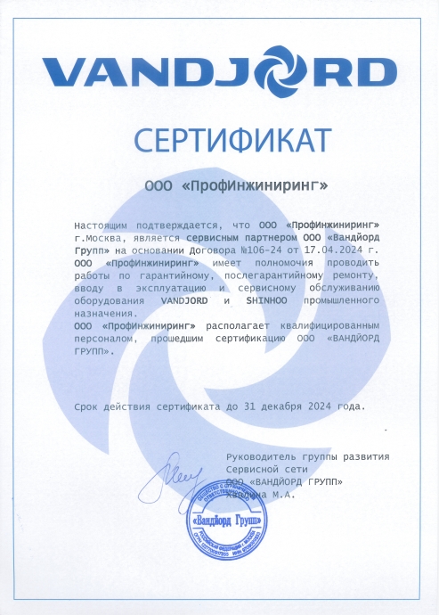 Сертификат Vandjord Преображенский Роман Владимирович